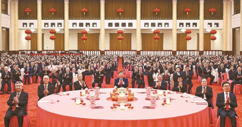 人民大会堂宴会厅灯光璀璨、喜气洋洋,各界人士2000多人欢聚一堂、共迎佳节,现场洋溢着欢乐祥和的节日气氛。