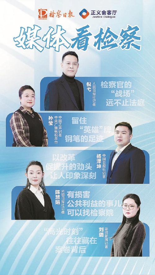 近日,本报特别邀请人民日报社、中央广播电视总台、光明日报社、中国日报社、澎湃新闻的“跑口记者”做客“正义会客厅”,围绕他们眼里的检察关键词、印象深刻的案例及检察官等,分享2025年采访报道检察工作的体会和感受。 (海报设计:察画汇创意社 张东魁)