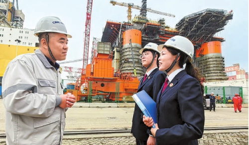 山东省烟台市芝罘区检察院干警前往烟台中集来福士海洋工程有限公司“把脉问诊”,了解企业涉法难题,并提出针对性建议。