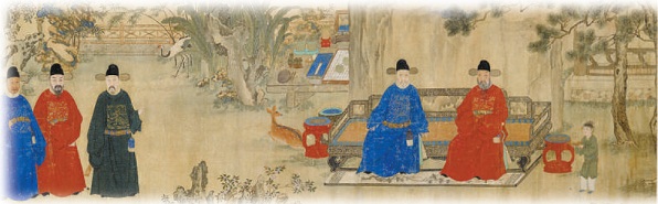 图⑥:明·《五同会图》,现藏于故宫博物院。其中正四品南京都察院左佥都御史陈璚(左三)身着有织金獬豸补子的绿色獬豸补服