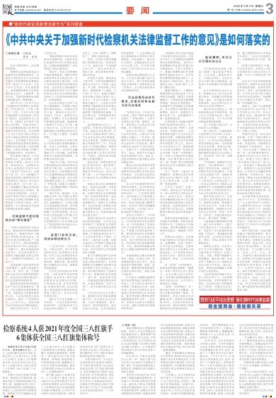 2021年6月,《中共中央关于加强新时代检察机关法律监督工作的意见》(下称《意见》)印发。中共中央专门就加强检察机关法律监督工作印发《意见》,这在党的历史上是第一次。《意见》在中国共产党成立100周年、党绝对领导下的人民检察制度创立90周年的重要历史时刻发布,充分体现了以习近平同志为核心的党中央深入推进全面依法治国的坚定决心,充分体现了党中央对完善党和国家监督体系特别是检察机关法律监督工作的高度重视,为新时代检察工作赋予了更重政治责任、历史责任。