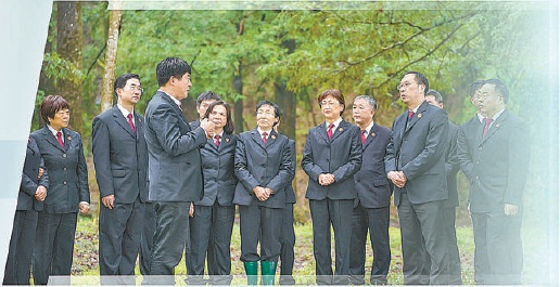 在新安江源头的古林公园,李发权(前排左)代表向检察干警介绍古树保护及水源涵养情况。