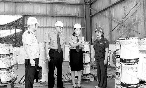 今年6月,江苏省徐州市云龙区检察院在办理一起涉嫌危险作业犯罪案件时发现,辖区危化品生产企业存在安全生产隐患。为及时封堵辖区危化品生产企业安全隐患漏洞,近日,该院协同区应急管理局,对辖区危化品生产企业开展安全生产大排查活动。检察官和工作人员实地察看危化品储存场所,督促企业做好高温天气危化品安全管理,加强通风、降温管理,加大仓库巡检频次,确保安全生产。图为检察官用温湿度测试计现场检测危化品储存仓库温湿度情况。 本报通讯员金磊 张幸摄