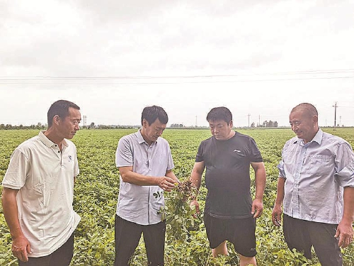 海国勇(左二)为合作社社员讲解花生病虫害防治知识。