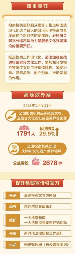 数据显示,2023年1月至11月,全国检察机关共起诉损毁文物、盗掘古文化遗址或古墓葬等犯罪1791人,同比上升29.9%。同时,各地检察机关加强对红色资源、长征文化、石窟寺、传统村落和非物质文化遗产公益的保护力度,共办理文物和文化遗产保护领域公益诉讼2678件。