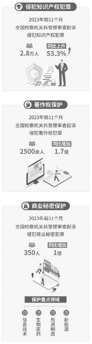 据了解,2023年前11个月,全国检察机关共受理审查起诉侵犯知识产权犯罪2.8万人,同比上升53.3%;受理知识产权民事行政诉讼监督案件2240件,同比增加1.7倍,提出抗诉和再审检察建议600余件,同比增加7.7倍;立案办理知识产权公益诉讼案件570余件。