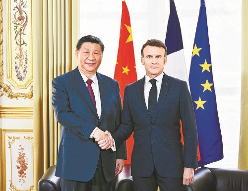 马克龙表示,今年法中将共同隆重庆祝法中建交60周年。法中关系友好,合作富有成效,不仅涉及高尖端技术,也包括气候变化、海洋多样性等全球性议题。习近平主席访问期间,双方签署多项合作协议,再次彰显法中合作的潜力和前景。当前,世界面临诸多紧迫挑战,法中关系处于承前启后的关键时刻。法中关系具有深厚底蕴,双方相互尊重,着眼长远,加强合作,将为解决全球性挑战、避免集团对立对抗发挥重要积极作用。法方希望同中方进一步密切双边经济关系和多边沟通协作,推动法中战略伙伴关系取得更多成果。法方希望向中国出口更多农产品,同时将对中国保持市场开放,不会针对中国企业搞歧视性政策,欢迎更多中国企业包括高技术企业赴法投资合作。法方愿同中方加强航天航空、民用核能等领域合作,共同办好今年法中文化旅游年活动,欢迎中方派团出席巴黎奥运会。法方愿就气候变化、生物多样性保护、人工智能等全球性问题同中方密切沟通合作,共同维护多边主义、联合国宪章宗旨和国际法。