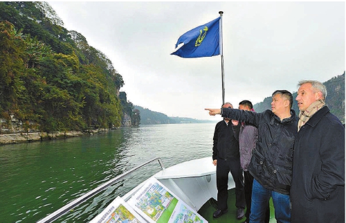 2020年11月23日,龙迪(右一)等人到湖北宜昌开展中外生态保护比较研究,王朝阳(右二)向龙迪介绍长江流域生态保护公益诉讼相关工作情况。 本报通讯员李涛摄