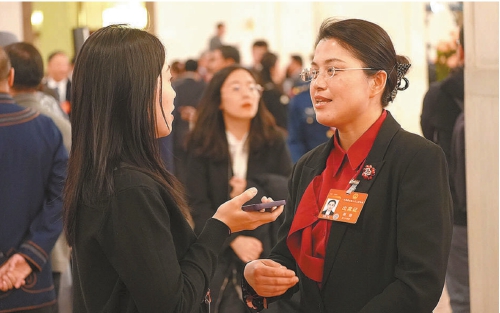 今年全国两会期间,谢丽(右)接受媒体记者采访。