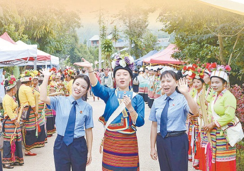 玉喃溜(左)和同事送法进布朗族“禾腊咪”节活动现场。