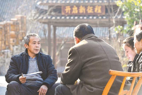 毛相林(左一)与村民讨论村务。