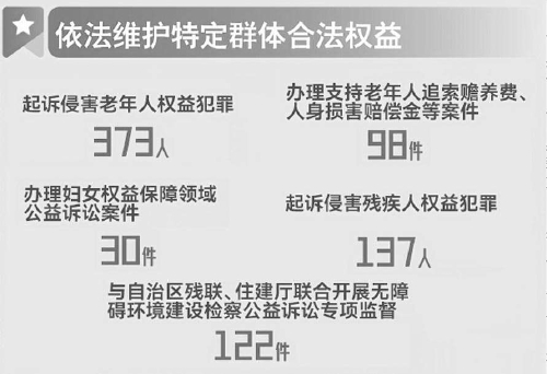 本报讯(记者何海燕 通讯员赵祥建)“用心办好司法为民实事,与自治区残联、住建厅联合开展无障碍环境建设检察公益诉讼专项监督,立案122件。”1月20日,新疆维吾尔自治区检察院检察长高继明在自治区十四届人大三次会议上作检察工作报告,检察机关用心办好群众身边案、依法维护特定群体合法权益等内容受到与会人员的关注与点赞。