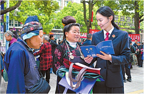 近日,贵州省丹寨县检察院检察官走进县城赶集小巷,向群众宣传国家安全法、反有组织犯罪法等法律法规,引导群众树牢“国家安全 人人有责”意识。 本报记者林建安 通讯员龙东平摄