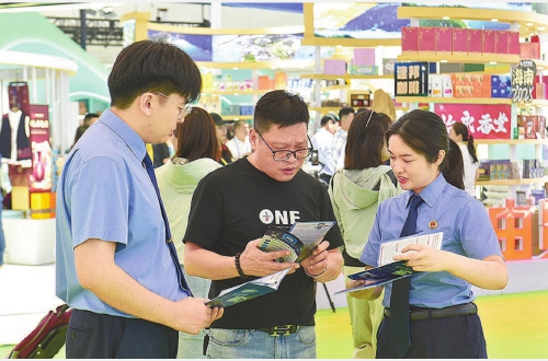 近日,第五届中国国际消费品博览会在海南海口举行,来自71个国家和地区的1700余家消费企业参展。图为海南省检察机关干警在消博会现场走访参展商和观众,普及知识产权相关法律知识。 本报记者杨帆摄