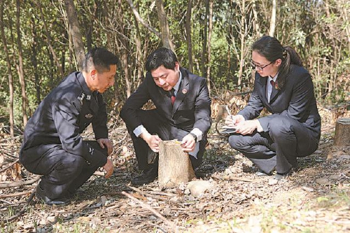 近日,湖北省宜昌市猇亭区检察院公益诉讼检察官在履职中发现一起滥伐林木破坏森林资源的案件线索后,前往案发现场开展现场勘查取证等工作。 本报记者蒋长顺 通讯员辜成枢摄