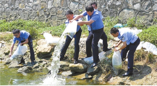 近日,湖北省宜昌市夷陵区检察院联合该区法院、区公安分局、区综合行政执法局等单位开展生态修复增殖放流活动,在黄柏河人寿桥段放流鱼苗万余尾。据了解,本次活动购买鱼苗的资金来源于该院办理的3起非法捕捞水产品案件当事人所缴纳的生态环境损害赔偿金。 本报记者蒋长顺 通讯员何骁摄