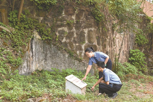 湖南省衡阳市雁峰区检察院检察官查看五桂岭绝壁遗址标识碑。