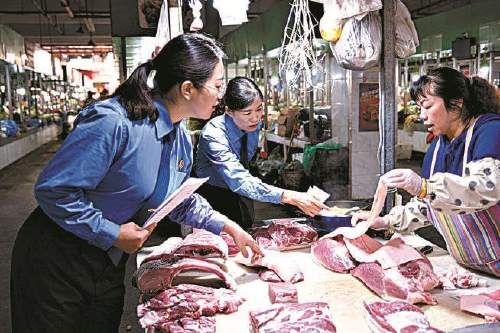 10月23日,贵州省盘州市检察院检察官到当地农贸市场开展“回头看”,向售卖猪肉的商户了解整改情况。