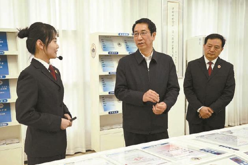 河南省检察院党组书记、检察长段文龙(中)到开封市检察机关调研指导工作,参观开封市检察院案件质量推优评差反向审视展讲中心。