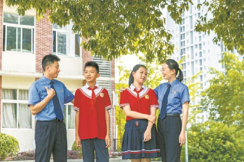 今年5月,渝检护“未”团队代表在重庆市北碚区两江名居第一小学开展校园普法活动。图为龚珊(右一)、唐焕然(左一)和孩子们交流。