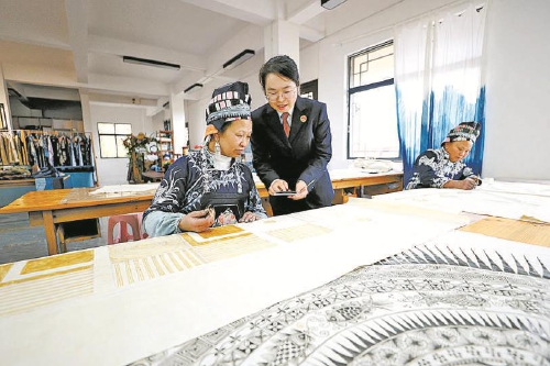 近日,贵州省丹寨县检察院检察官走进非遗工坊,普及知识产权保护、妇女劳动权益保障等法律知识,并为工坊解答“如何强化原创设计保护”等问题,为护航非遗产业发展注入检察力量。 本报记者林建安 通讯员杨武魁摄