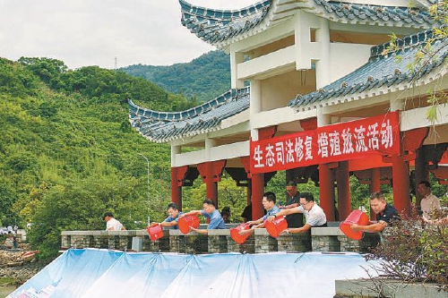 今年6月,福建省福州市、连江县两级检察院、法院联同县海洋与渔业局在琯头镇长门村闽江口增殖放流点,开展生态司法修复增殖放流活动,促进改善闽江水域生态环境。
