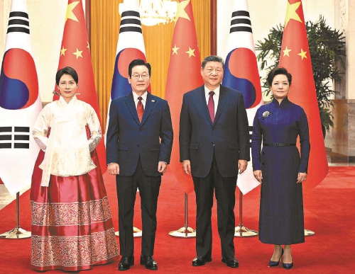 一月五日下午,国家主席习近平在北京人民大会堂同来华进行国事访问的韩国总统李在明举行会谈。这是会谈前,习近平和夫人彭丽媛同李在明和夫人金惠景合影。 新华社记者谢环驰摄