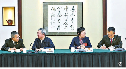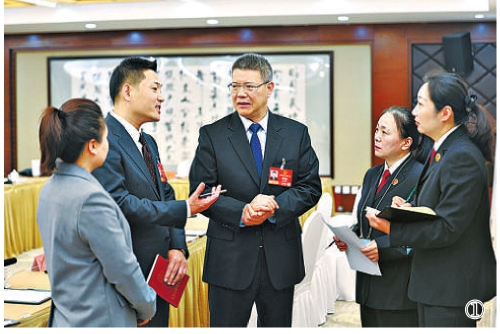 图①:最高检工作人员向全国人大代表李丹丹(左一)、李建卫(左二)、黄明耀(中)了解对最高检工作报告的意见和建议。