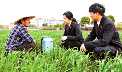 3月12日,在“3·15”国际消费者权益日来临之际,浙江省东阳市检察院干警来到该市种粮大户的小麦种植基地,走访了解春耕备耕情况,并结合该院近期办结的一起制售假农药案件开展普法宣传。 本报全媒体记者龚婵婵 通讯员吴爱晶 邓俊摄